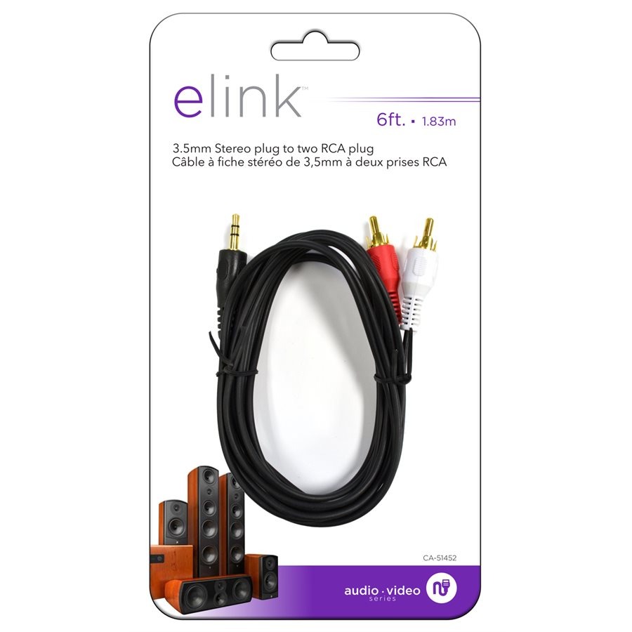 1,83 mm (6ft) Cable 3.5 mm stereo plug to two RCA plugs Connects a device with a 3.5mmstereo plug to a device with left & right audio RCA plugs